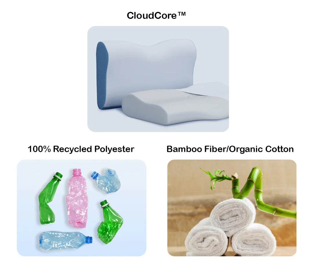 At the heart of our products lies the patented CloudCore™ foam, designed with cutting-edge technology to deliver the perfect balance of support and softness, adapting seamlessly to your body for maximum comfort. Committed to sustainability, we incorporate 100% recycled polyester, giving materials a second life and reducing waste. Additionally, we use natural bamboo fiber and organic cotton, providing breathable, hypoallergenic fabrics that are gentle on both you and the planet. Every detail is crafted with care, combining innovation, comfort, and a commitment to a more sustainable future.